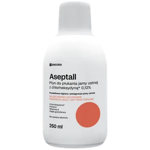 Produkt Aseptall, płyn do płukania jamy ustnej z chlorheksydyną 0,12%, 250 ml do kupienia w Gemini. Aseptall to innowacyjny płyn do płukania jamy ustnej, który łączy działanie antyseptyczne, regenerujące i odświeżające. ...