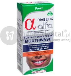 ALFA DIABETIC Fresh to stomatologiczny płyn dla diabetyków przeznaczony dla osób po zabiegach implantologicznych i ekstrakcjach zęba. Zalecany do stosowania od pierwszego zabiegu przez cały okres gojenia, jak i później do higieny codziennej.