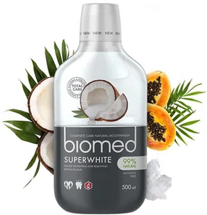 BIOMED SuperWhite stanowi doskonałe uzupełnienie codziennej higieny jamy ustnej. Polecany jest do stosowania dla osób pragnących zachować biały uśmiech, z tendencją do tworzenia się kamienia nazębnego oraz w celu wzmocnienia zębów i dziąseł. Płyn posiada smak mięty z nutą kokosową, który zwiększa komfort stosowania oraz zapewnia długotrwałe uczycie świeżości. Płyn BIOMED SuperWhite polecany jest do stosowania wraz z pastą wybielającą BIOMED SuperWhite. Zalety płynu do płukania BIOMED SuperWhite: