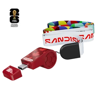 ² Z uniwersalnym złączem USB-C™ możesz bezproblemowo dzielić się swoją pasją z innymi bez względu na posiadane urządzenie – czy jest to kompatybilny telefon bądź tablet z systemem Android™, czy też komputer z systemem macOS lub Windows® i nie tylko. 5 Do wyboru masz cztery unikalne wzory gwizdków4 uświetniające mistrzostwa świata FIFA World Cup™ i każdy z trzech krajów-gospodarzy: Kanadę, Meksyk i Stany Zjednoczone. Dołączona smycz i naklejka z limitowanej edycji pozwalają dzielić się swoją miłością do królowej sportu i najbardziej ekscytującego wydarzenia w historii tej dyscypliny. | SanDisk USB-C Flash Drive: