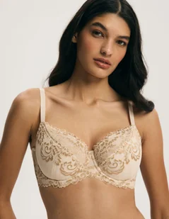 Biustonosz półusztywniany VENUS Esotiq | beżowy Biustonosz VENUS w odcieniu beżu to elegancka propozycja dla kobiet, które cenią połączenie wyrafinowanego stylu z codziennym komfortem. Delikatna, bogato zdobiona koronka o ornamentalnym wzorze subtelnie podkreśla biust, a lekki kontrast kolorystyczny dodaje całości głębi i luksusowego charakteru. Klasyczna, kobieca linia sprawia, że model doskonale prezentuje się zarówno pod dopasowanymi, jak i bardziej miękkimi stylizacjami. Półusztywniana konstrukcja miseczek zapewnia naturalne uniesienie i ładne uformowanie biustu, jednocześnie zachowując lekkość noszenia. Wewnętrzna część miseczki została wykończona miękką bawełną, co zwiększa komfort nawet przy dłuższym użytkowaniu.