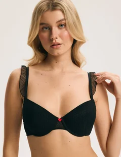 subtelna falbanka z siateczki przy ramiączkach, ozdobne regulatory w kształcie serduszek oraz czerwone haftowane serce umieszczone z przodu – element, który można łatwo usunąć, dopasowując biustonosz do własnego stylu. Cechy produktu biustonosz push-up z usztywnianymi miseczkami konstrukcja modelująca i unosząca biust materiał z delikatnego meshu w drobne kropeczki bawełniane wykończenie wnętrza miseczek ozdobna falbanka z siateczki na ramiączkach regulatory w kształcie serduszek czerwone haftowane serduszko z przodu (możliwość odprucia) regulowane ramiączka i zapięcie z tyłu Skład materiał zewnętrzny: 79% poliamid, 21% elastan siateczkowe skrzydełka: 89% poliamid, 11% elastan wyścielenie miseczki: 100% bawełna