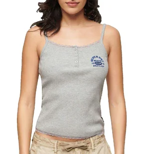 Delikatny top, który doda elegancji Twoim codziennym stylizacjom. Wyróżnij się z tym zapinanym na guziki topem Athletic Essentials, zaprojektowanym, aby subtelnie podkreślić rzemieślniczy charakter Twojego wyglądu. Noś go solo dla minimalistycznego efektu lub w zestawieniu z innymi elementami garderoby dla autentycznego looku. Dopasowany krój, cienkie regulowane ramiączka, prążkowany materiał i koronkowa lamówka. Uzupełnieniem jest wyszywane logo Superdry oraz charakterystyczna metka Superdry.
