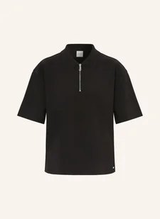 Krótkie rękawy. Prosty krój. Boczne rozcięcia. Kołnierzyk polo. Jednolity kolor. Gładki ścieg. Krótka listwa z zamkiem błyskawicznym. Ziarnista faktura materiału. Elastyczny materiał