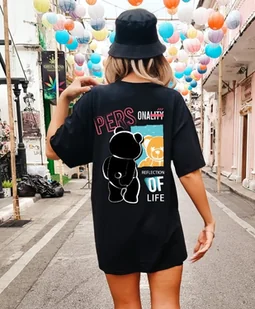 Obniżona linia ramion dodaje streetwearowego charakteru, a szerokie rękawy i wydłużony tył sprawiają, że koszulka świetnie prezentuje się zarówno wpuszczona w spodnie, jak i noszona na luzie. DesignKoszulka wyróżnia się efektownym nadrukiem na plecach, który nadaje jej unikalny wygląd. W zależności od wzoru może być minimalistyczna i subtelna lub bardziej wyrazista – idealna dla kobiet, które lubią wyróżniać się w tłumie. Czysta czerń materiału sprawia, że nadruk jest dobrze widoczny, a całość prezentuje się nowocześnie i stylowo. StylizacjeDzięki uniwersalnej kolorystyce i prostemu, ale wyrazistemu fasonowi, koszulka pasuje do wielu stylizacji.