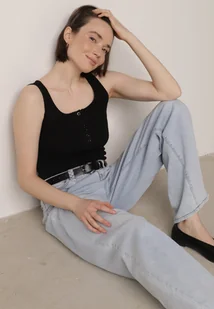 Czarny Prążkowany Top na Szerokich Ramiączkach z Bawełny Zdobiony Guzikami Bernella