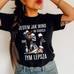 Damska koszulka na prezent na 40 urodziny - jestem jak wino im starsza tym lepsza Czarna koszulka damska idealna na 40. urodziny to świetny pomysł na prezent dla kobiety z poczuciem humoru! Wykonana z wysokiej jakości bawełny, jest wygodna i miła w dotyku, zapewniając komfort noszenia przez cały dzień. Na przodzie koszulki znajduje się oryginalny nadruk w stylowym designie: "Jestem jak wino – im starsza, tym lepsza", co podkreśla wyjątkowość solenizantki i jej pozytywne podejście do życia. Nadruk wykonano trwałą metodą, dzięki czemu nie blaknie i nie pęka nawet po wielu praniach.