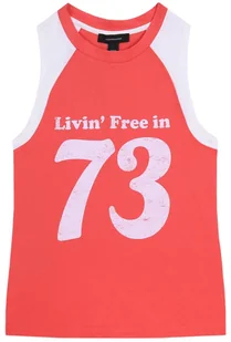 Damska, sportowa, koralowo-beżowa koszulka bez rękawów. Z przodu biały nadruk "Livin' Free in 73". Wykonana z przyjemnego w dotyku materiału. Rozmiary odzież...