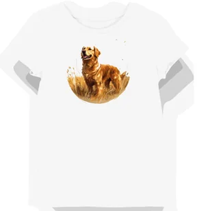 Koszulka damska biała z nadrukiem złotego retrievera na tle łąki XXL - Koszulka damska idealna na prezent! KozakNadruki – Polska marka i autorskie projekty! ...