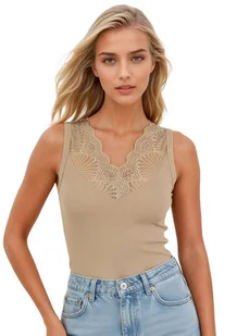Koszulka Marcela to połączenie codziennego komfortu i subtelnej, kobiecej elegancji. Model na szerokich ramiączkach zachwyca klasycznym krojem oraz starannie dopracowanymi detalami, które nadają mu wyjątkowego charakteru. Szczególną uwagę przyciąga dekolt w kształcie litery V wykończony półprzezroczystą koronką o dekoracyjnym wzorze przypominającym rozłożone wachlarze. Delikatna koronka pięknie podkreśla linię szyi i dekoltu, dodając całości lekkości i elegancji. Koszulka została wykonana z wysokiej jakości dzianiny zawierającej wiskozę, dzięki czemu jest miękka, przewiewna i przyjemna dla skóry.
