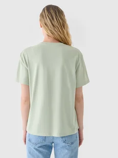 Nie prześwituje oraz zapewnia trwałość i wygodę podczas całorocznego noszenia. T-shirt 4F damski jest wykonany w 100% z bawełny organicznej, co zostało potwierdzone certyfikatami niezależnych instytucji certyfikujących lub licencjami. Materiał pozwala skórze oddychać oraz dobrze pochłania wilgoć. Okrągły dekolt jest zakończony lekkim ribowaniem. Z przodu widoczny niewielki nadruk z motywem gór i napisem "FOB".