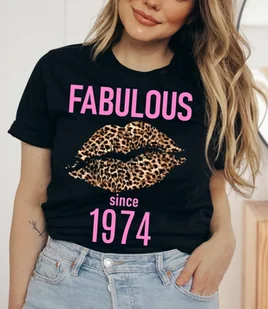 Koszulka na 50 uorodziny usta panterka dla kobiety. T-shirt damski o modnym kroju. Rękawki proste. Koszulka z wyjątkową grafiką . Bluzeczka wykonana z bawełny.