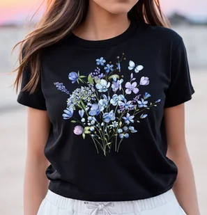 Czarna damska Koszulka w kwiaty . T-shirt damski o modnym kroju. Rękawki proste. Koszulka z wyjątkową grafiką . Bluzeczka wykonana z bawełny.