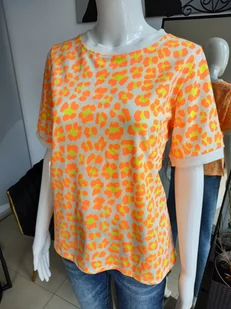 koszulka o regularnym kroju materiał bawełniany, delikatnie elastyczny okrągły dekolt krótkie, nieopinające rękawy kolorowa panterka w neonowym pomarańczowo-...