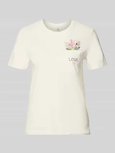 damski t-shirt marki Only;Model „Polly”;efekt: jednolity kolor;Krój: krój regular fit;Aplikacja: nadruk z napisem, wyhaftowany motyw;dekolt: okrągły dekolt;rękaw: