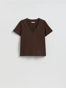 Reserved - T-shirt regular z dekoltem V - ciemnobrązowy
