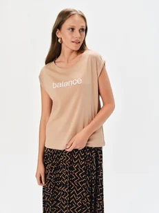 T-shirt z krótkim rękawem w kolorze beżowym, to idealna propozycja dla kobiet ceniących komfort i styl. Wykonany z wysokiej jakości materiału, zapewnia wygodę noszenia na co dzień. Na przodzie znajduje się subtelny nadruk z napisem "balance", dodający koszulce nowoczesnego charakteru. Uniwersalny beżowy odcień sprawia, że łatwo zestawić go z różnorodnymi elementami garderoby, tworząc modne i spójne stylizacje.