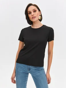 T-shirt damski Top Secret elegancki w prążek. T-shirt damski o klasycznym luźnym kroju z krótkim rękawem zakończonym przeszyciem. Posiada on okrągłe wykończenie wokół szyi z ozdobną lamówką wokół, będąc wzbogaconym na całości o delikatne efektowne prążkowanie. Jest on doskonałym uzupełnieniem praktycznie każdej kobiecy stylizacji w okresie wiosennym i letnim, będąc odpowiednim wyborem zarówno dla stroju do pracy, jak i również podczas weekendu. T-shirt dostępny w kolorze czarnym SPO6135CA.