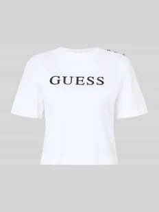 T-shirt damski Guess;Czysta bawełna;Krój krótki;Model ‘MARINA’;Okrągły dekolt;Logo;Długość tyłu w rozmiarze S: 45 cm