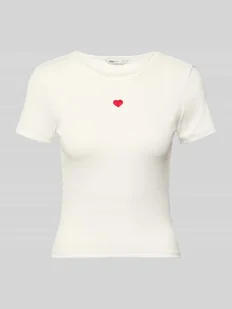 Damski t-shirt marki Only;Model „Elva June”;Efekt: jednolity kolor;Krój: Krój slim fit;Aplikacja: Wyhaftowane serce;Dekolt: Okrągły dekolt;Rękaw: krótki rękaw;Obróbka materiału: prążek