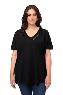Ulla Popken Damska koszulka z długim rękawem, ozdobne fałdy, oversize, dekolt w serek, do połowy rękawów, czarny, 50/52