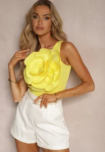 Żółty Top bez Rękawów z Asymetrycznym Dekoltem z Dużą Aplikacją w Kształcie Kwiatka Vernia