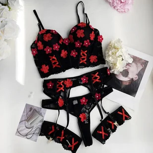 4-częściowy zestaw koronkowej bielizny z motywem kwiatowym - Czarny S