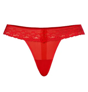 - Stringi damskie w kolorze czerwonym- Wysokogatunkowa siateczka, przyjemna dla kobiecego ciała- Delikatna koronka wszyta po bokach