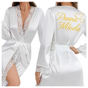 Szlafrok damski z koronką satynowy z napisem Panna Młoda - L