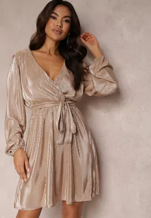 Beżowo-Złota Błyszcząca Sukienka Kopertowa Vengas