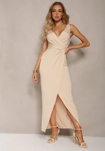 Beżowa Kopertowa Sukienka w Koktajlowym Stylu z MarszczeniemKalkisa