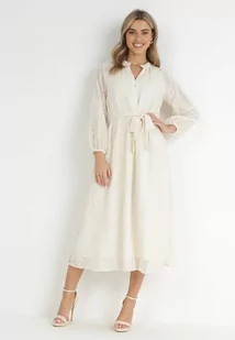 Beżowa Koszulowa Sukienka na Guziki z Paskiem Mejia