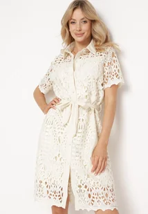 Beżowa Koszulowa Sukienka z Koronkowej Tkaniny z Materiałowym Paskiem Noraly