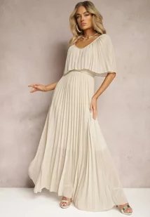 Beżowa Plisowana Sukienka z Gumką w Pasie z Falbaną Przy Dekolcie Drenia