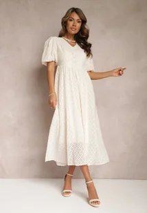 Beżowa Rozkloszowana Sukienka Haftowana Maxi z Krótkim Rękawem Garneta