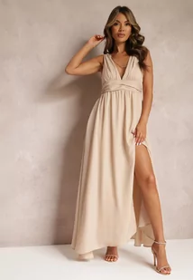 Beżowa Rozkloszowana Sukienka Maxi na Ramiączkach z Rozcięciem Ernames