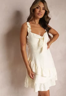 Beżowa Sukienka na Szerokich Ramiączkach z Wiązaniem i Falbankami Birgitesa