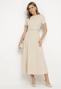 Beżowa Sukienka o Rozkloszowanym Kroju z Ozdobnym Paskiem Desiliena