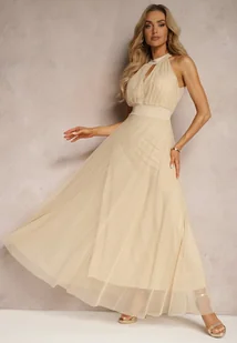 Beżowa Wieczorowa Sukienka ze Stójką Wiązana w Talii Ozdobiona Siateczką Nestasoni