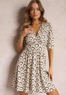 Beżowa Rozkloszowana Sukienka z Bufiastymi Rękawami w Geometryczny Wzór Avory
