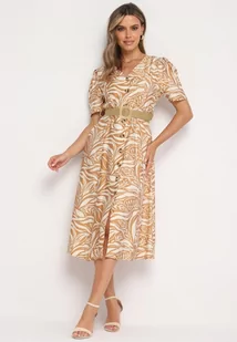 Beżowa Sukienka o Koszulowym Kroju z Plecionym Paskiem w Talii Zaratia
