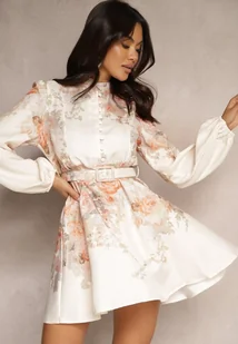 Beżowa Sukienka o Rozkloszowanym Kroju z Paskiem w Kwiaty Melvivis