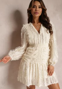 Beżowa Sukienka Rozkloszowana z Wystrzępieniem i Koronką Avela