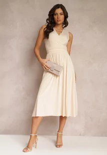 Beżowa Sukienka z Kopertowym Dekoltem i Plisowanym Dołem Anamarie