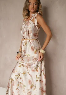 Beżowa Satynowa Sukienka w Kwiaty Fenaresia