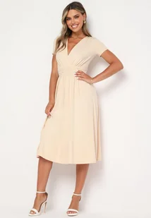 Beżowa Taliowana Sukienka z Dekoltem na Zakładkę Quimadea