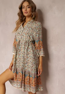 Beżowa Rozkloszowana Sukienka w Kwiaty z Wiskozy Ściągana w Pasie Lennyn
