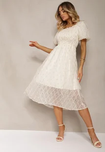 Beżowo-Różowa Rozkloszowana Sukienka z Bufiastymi Rękawami i Marszczoną Górą Vikinania