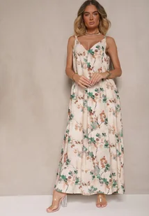 Beżowo-Zielona Kwiecista Sukienka na Ramiączkach z Wiskozą o Rozkloszowanym Kroju Jenarienna
