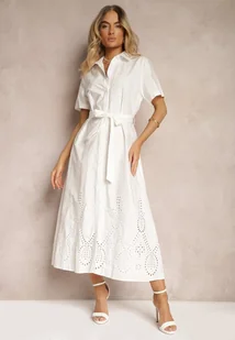 Biała Bawełniana Sukienka o Ażurowym Wykończeniu z Paskiem w Talii Zapinana na Guziki Dimosha